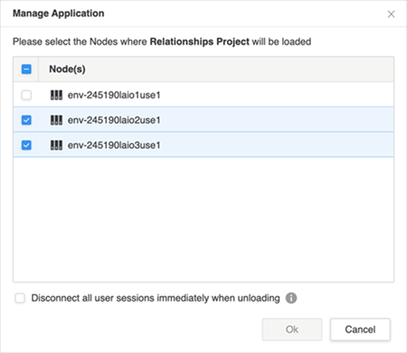 - Cliquez sur Mettre à jour pour modifier l'état de charge ou de décharge entre différents nœuds de serveur en sélectionnant ou en désélectionnant les nœuds. Déconnecter toutes les sessions utilisateur immédiatement lors du déchargement annule directement toutes les tâches en cours d'exécution et les sessions utilisateur connectées, au lieu d'attendre que toutes les tâches soient terminées et que les sessions soient déconnectées avant le déchargement.