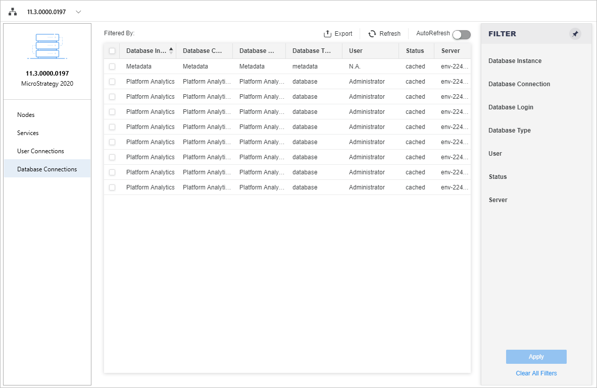 Cliquez ici pour afficher des détails sur le moniteur de connexion à la base de données.Panneau Filtre Répertorie tous les champs affichés dans la grille de connexion de la base de données. Vous pouvez effectuer plusieurs sélections et appliquer le filtre à la grille de connexion de la base de données. Le récapitulatif du filtre apparaît en haut du moniteur de connexion de base de données et vous pouvez supprimer des éléments ou effacer toutes les sélections de filtres à partir de là.