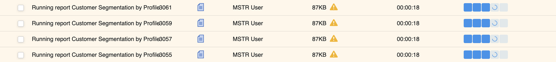 Dans MicroStrategy 2021 Update 3 et version ultérieure, Workstation fournit la fonctionnalité suivante pour les utilisateurs surveillant les tâches :