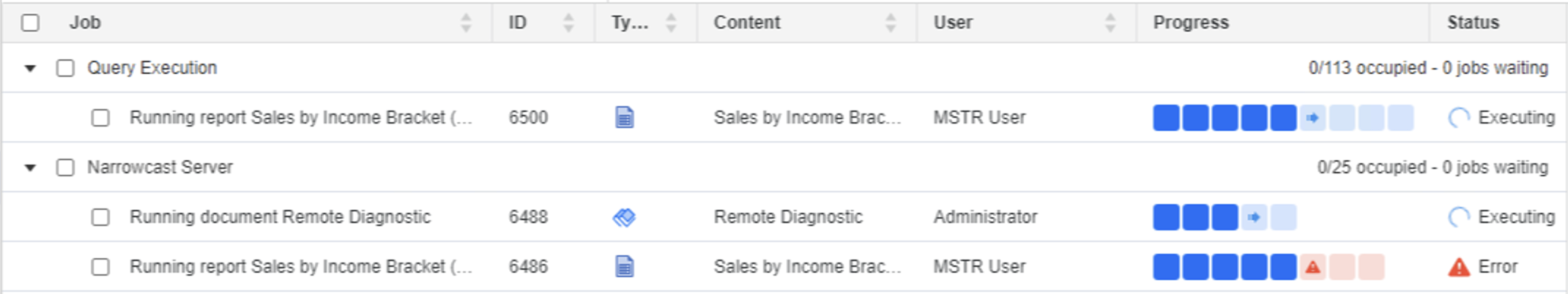 Le moniteur de tâche affiche les tâches qui sont en cours d'exécution sur un serveur Intelligence et les travaux qui ont produit des erreurs au cours des 30 dernières minutes. Lorsqu'une tâche s'est terminée avec succès ou a échoué il y a plus de 30 minutes, elle n'apparaît plus sur le moniteur. Vous pouvez afficher le numéro d'identification de la tâche ; l'utilisateur qui l'a soumis ; l'état de la tâche ; le type de tâche ; une description de l'état et le nom du rapport