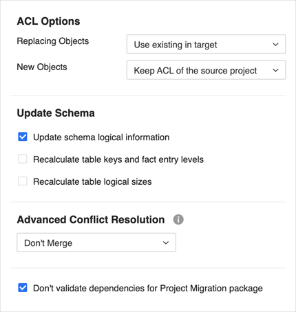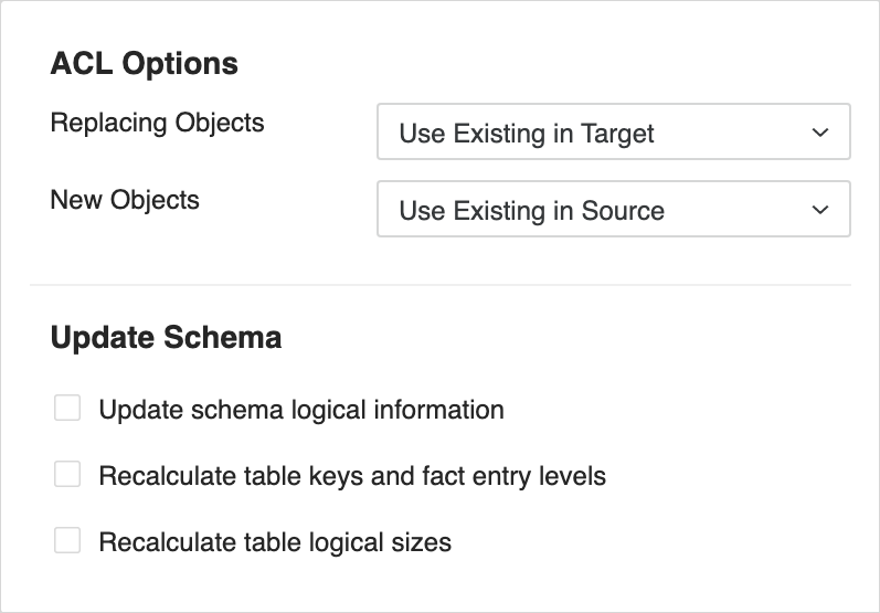 à définir ACL Options et Mettre à jour le schéma pour les objets de migration.Cliquez ici pour plus de détails sur les options.Le Options ACL contrôler quelles autorisations sont appliquées aux objets lorsqu'un conflit est résolu avec un Remplacer, Créer, ou Conserver les deux action.