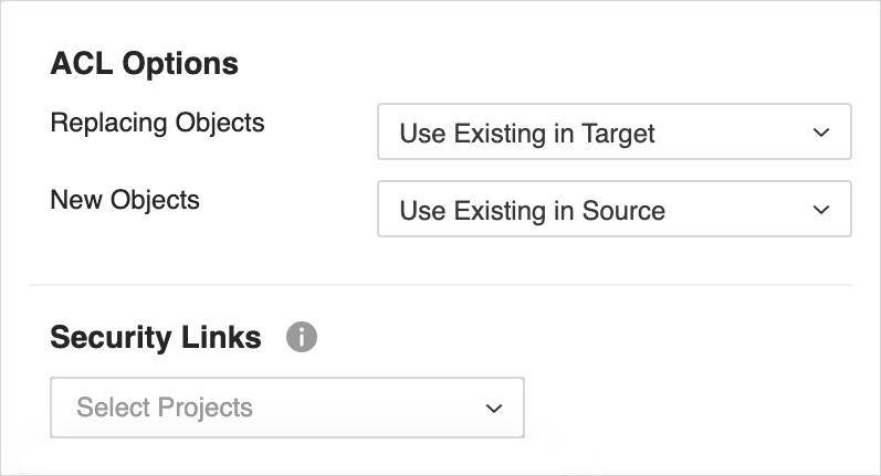 à définir ACL Options et Security Links pour les objets de migration.Cliquez ici pour plus de détails sur les options.Le Options ACL contrôler quelles autorisations sont appliquées aux objets lorsqu'un conflit est résolu avec un Remplacer, Créer, ou Conserver les deux action.