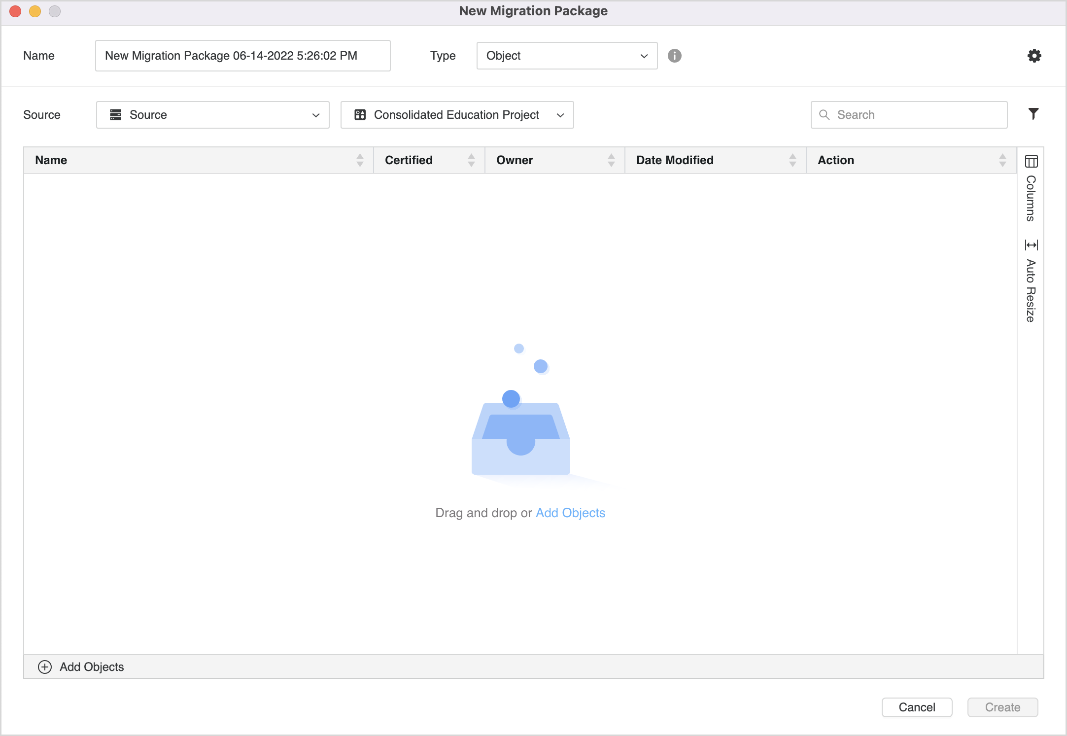 Cliquez sur Ajouter des objets pour ajouter du contenu à votre package.