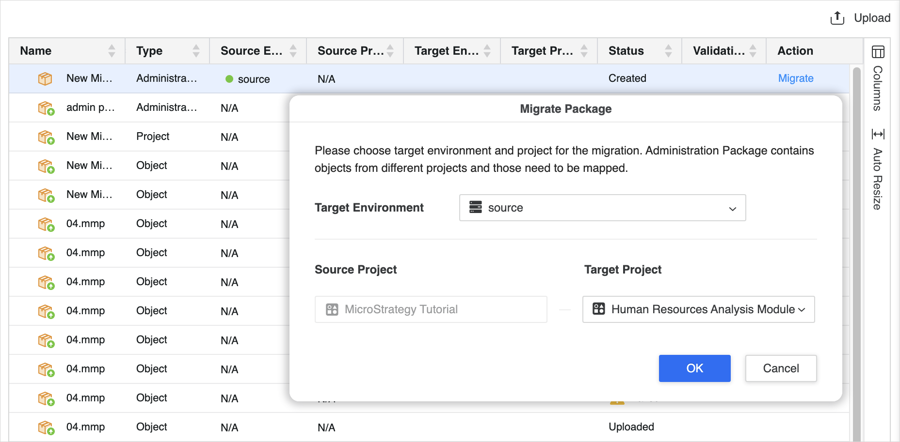 Suivre la progression du package dans la grille. Une fois que c'est terminé, cliquez sur Migrer dans la Action colonne.