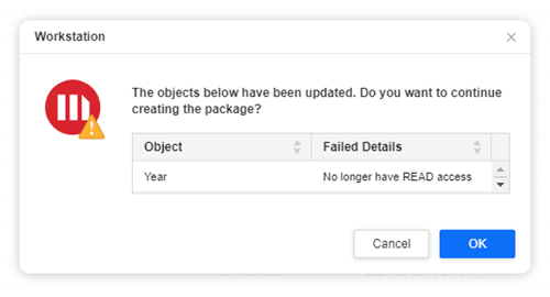 Si l'utilisateur ne dispose pas de l'ACL de lecture et de navigation lors de la création d'un package, l'objet ne peut pas être vu dans la boîte de dialogue Ajouter des objets et une erreur s'affiche lors du glisser-déplacer des objets dans la boîte de dialogue Créer un package.