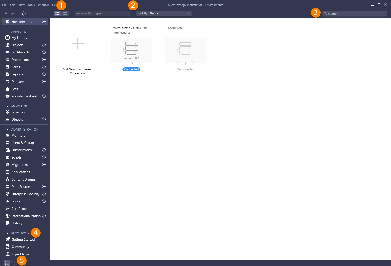 - Le volet de navigation est regroupé en dossiers intelligents pour vos environnements, tableaux de bord, etc. Utilisez-le pour accéder à des ressources importantes, telles que le Guide d'introduction et la MicroStrategy Community.