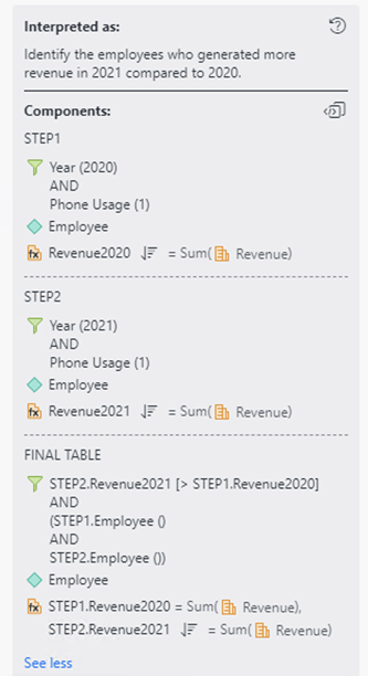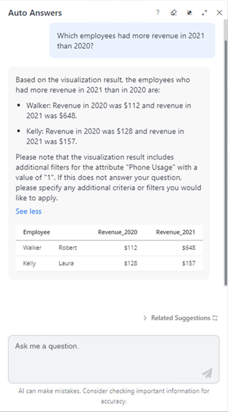 Si nous continuons avec l'exemple de tableau de bord ci-dessus et demandons aux réponses automatiques « Quels sont les employés qui ont réalisé le plus de chiffre d'affaires en 2021 qu'en 2020 ? », les réponses automatiques choisissent automatiquement un élément de la NAA pour éviter le retour d'une erreur et notifier l'utilisateur qu'un élément a été sélectionné au cas où l'utilisateur souhaite demander des informations sur un autre élément. L'interprétation affiche également la sélection.
