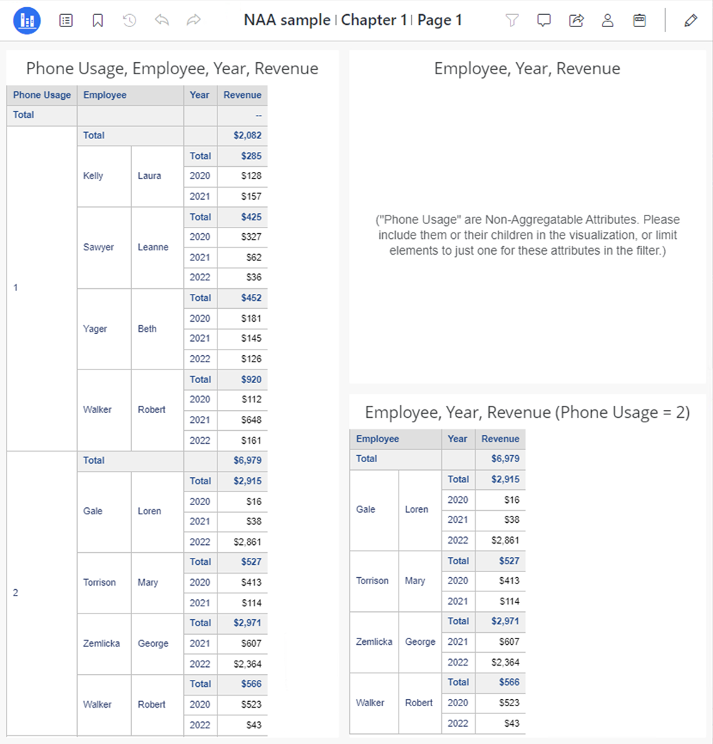 Pour cet exemple, l'attribut Utilisation du téléphone est désigné comme NAA. Dans la visualisation de gauche, lorsque l'utilisation du téléphone est présente, les revenus de chaque ligne s'affichent, mais pas le total général. En effet, le total général combinerait les valeurs de plusieurs éléments. La visualisation en haut à droite affiche une erreur, car l'utilisation du téléphone n'est pas présente sur la grille et la visualisation n'a pas été filtrée sur un élément unique. Si vous ajoutez un filtre par exemple, une utilisation du téléphone est égale à 2, les résultats sont renvoyés et il n'y a plus de problème dans l'évaluation du total général, comme indiqué dans la visualisation en bas à droite.
