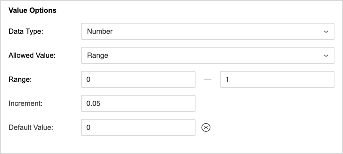• Plage Les utilisateurs choisissent à partir d'une plage de valeurs dans les limites et intervalles spécifiés.