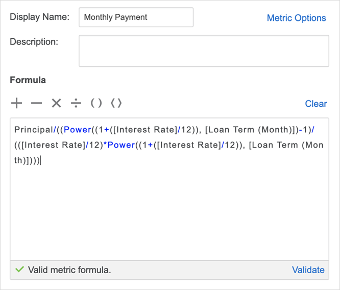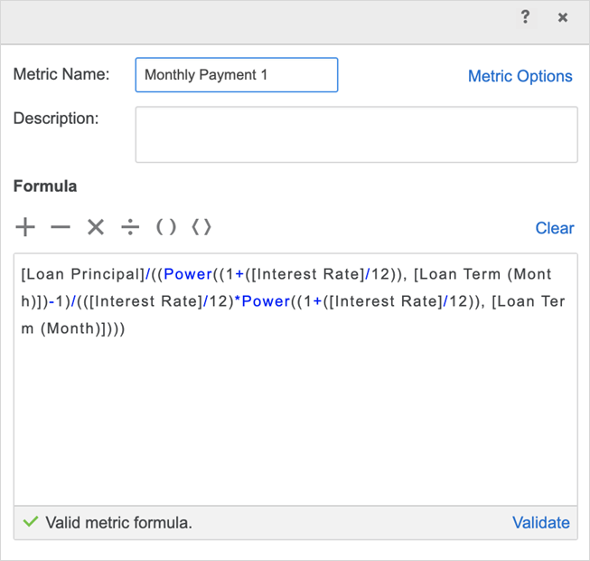 Copier[Loan Principal]/((Power((1+([Interest Rate]/12)), [Loan Term (Month)])-1)/(([Interest Rate]/12)*Power((1+([Interest Rate]/12)), [Loan Term (Month)])))[Loan Principal]est une mesure du jeu de données.