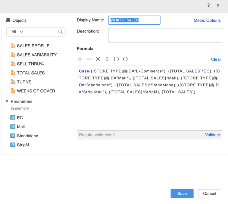 Il existe plusieurs façons d’effectuer une analyse d’hypothèse. Une façon consiste à créer un paramètre de valeur et à l'utiliser pour multiplier les mesures, par exemple [Cost] * [Cost Parameter], où le paramètre de coût est une valeur comprise entre 0,5 et 1,5.