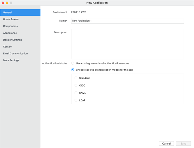Vous pouvez configurer les modes d'authentification disponibles pour différentes applications et indiquer un mode d'authentification par défaut. Après l'approvisionnement SAML, OIDC, ou LDAP configurations pour Library, l'éditeur d'applications permet à l'administrateur de choisir entre l'utilisation de la configuration au niveau du serveur ou de préciser lesquels de ces modes d'authentification sont disponibles pour l'application. L'administrateur peut choisir entre Standard, OIDC, SAML, et LDAP.