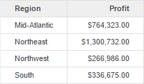 Si vous placez les objets Région, Chiffre d’affaires et Bénéfice sur une grille, toutes les régions apparaissent, même si Chiffre d’affaires et Bénéfice sont vides. Toutes les valeurs pour l’attribut Région apparaissent dans la grille car les deux jeux de données sont, par défaut, des jeux de données principaux.
