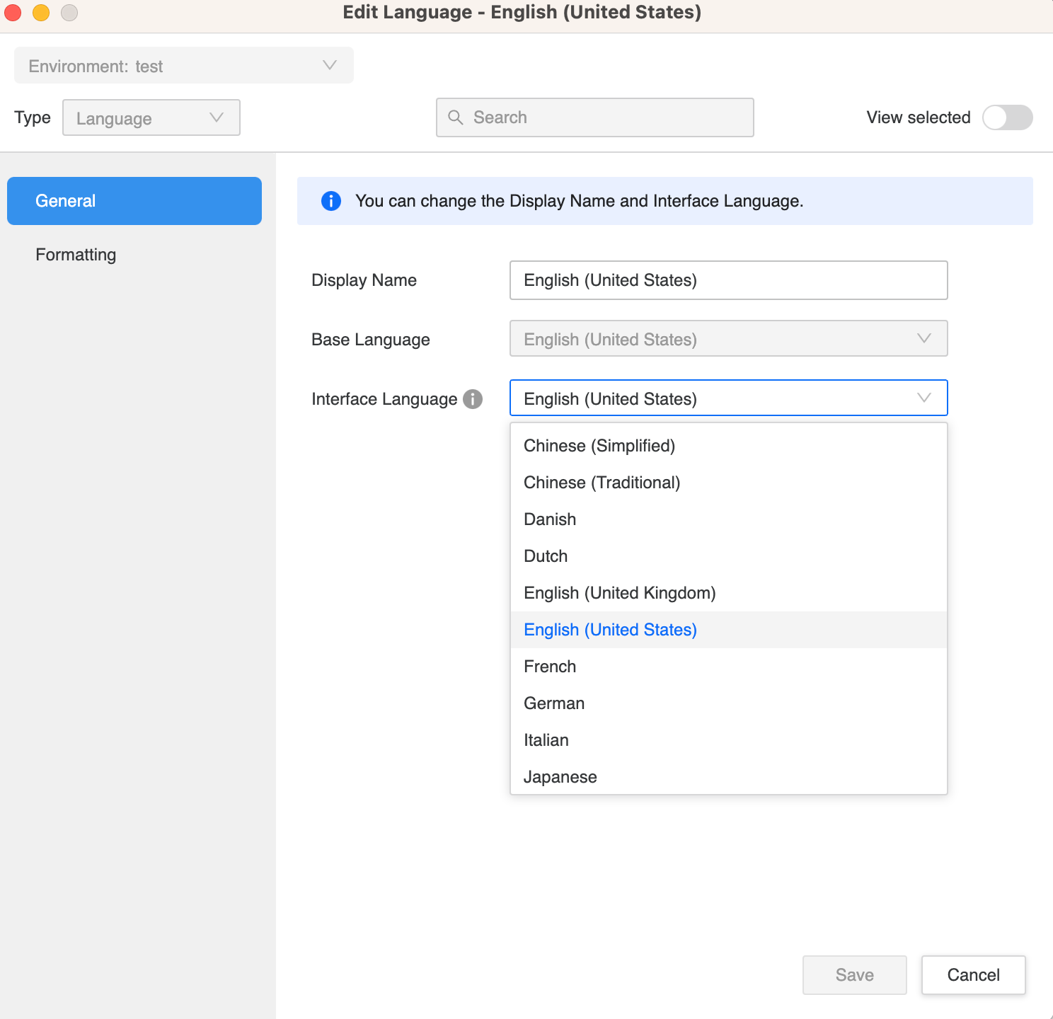À partir de MicroStrategy ONE Update 11, vous pouvez choisir la langue de l'interface souhaitée à partir de la Langue de l'interface liste déroulante.