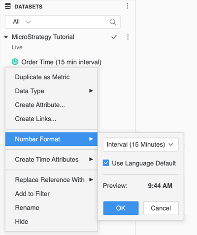 Dans un tableau de bord, ouvrez le panneau Jeux de données. À partir de MicroStrategy 2021 Update 9, vous pouvez également définir ce formatage au niveau du tableau de bord en utilisant le panneau Éditeur.