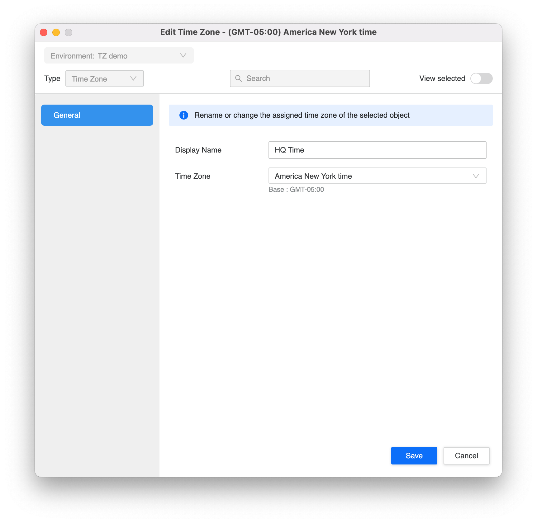 Modifiez le nom d'affichage ou le fuseau horaire associé.