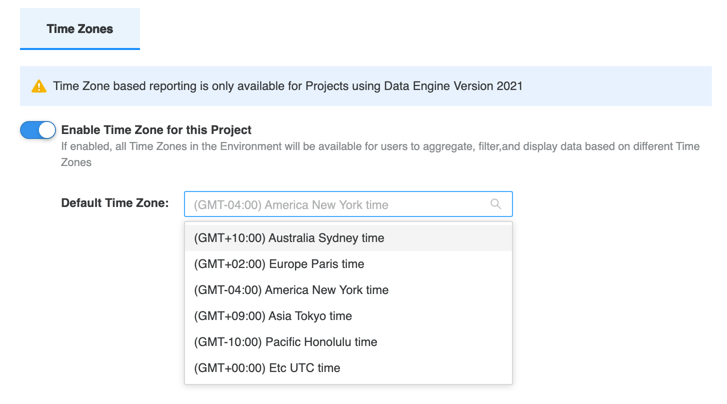 Pour utiliser le reporting basé sur un fuseau horaire, vous devez activer la fonctionnalité et définir un fuseau horaire par défaut pour un projet.