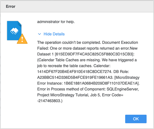 Error = Calendar Table Caches are missing. We have triggered a job to recreate the table caches. [MicroStrategy Error Instance: 1B6E1881A0684B209D8F110107DEAE1A]. Error in Process method of Component: SQLEngineServer, Project CalendarTesting, Job 5, Error Code= -2147463803.)