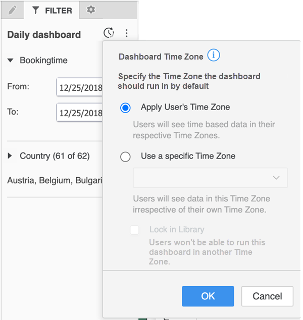 Sélectionner Appliquer le fuseau horaire de l'utilisateur pour ouvrir le tableau de bord dans le fuseau horaire défini pour l'utilisateur dans ses préférences Library. Le fuseau horaire peut également être affecté par l'administrateur via l'éditeur utilisateur. Si l'utilisateur n'a pas de fuseau horaire indiqué, le tableau de bord s'ouvre dans le fuseau horaire par défaut du projet.