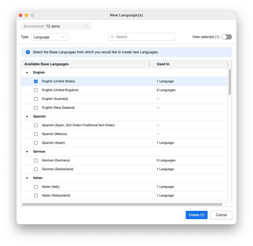 Sélectionnez les langues de base pour vos objets. Les langues de base ont des formats pertinents pour la langue et la région données.