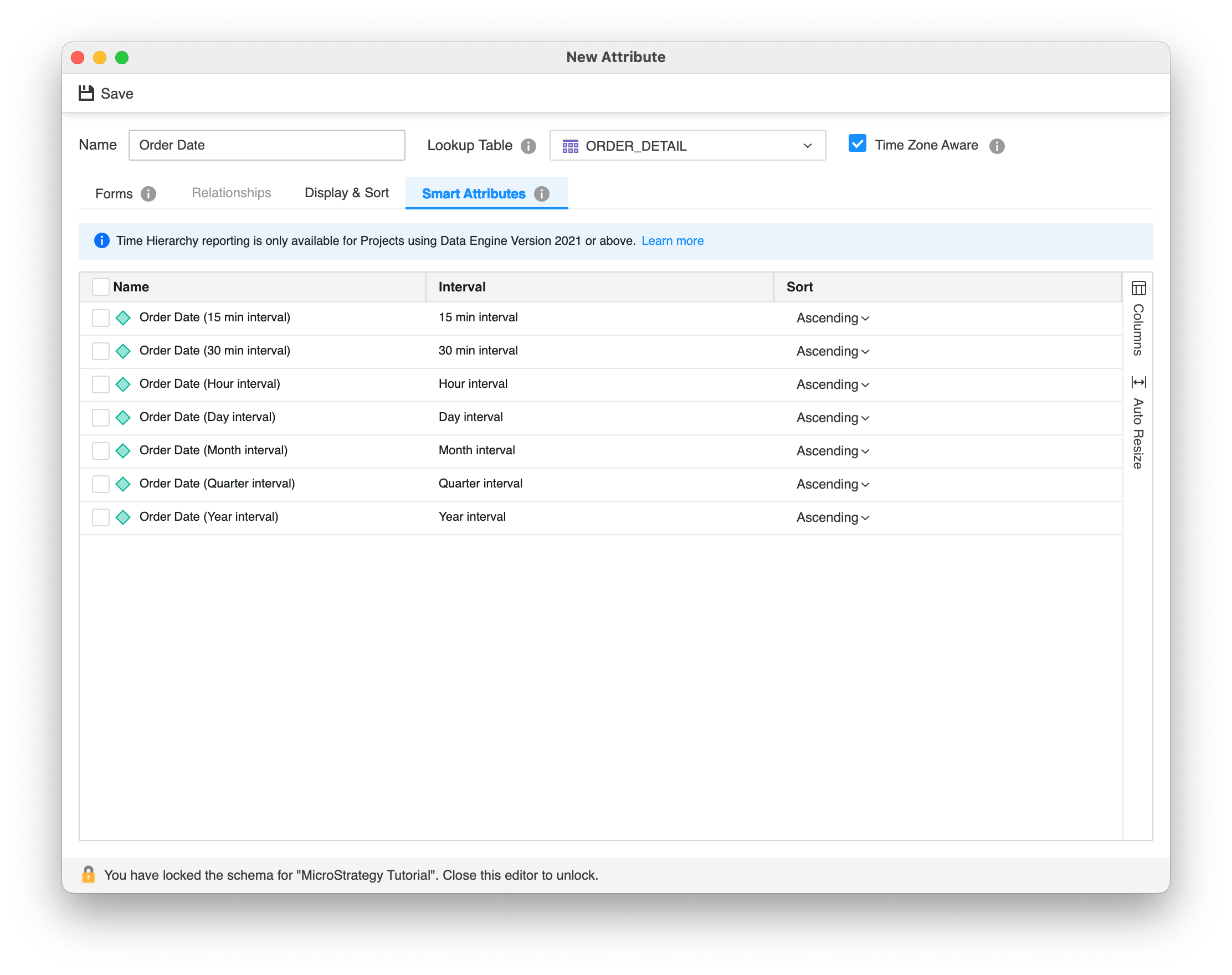 Pour compléter cette fonctionnalité, nous avons publié un nouvel ensemble d'attributs intelligents. Ces attributs intelligents représentent différents intervalles de temps et vous permettent de créer facilement une hiérarchie de temps complète sans avoir besoin de créer des attributs séparés pour chaque dimension et de maintenir des relations entre elles.