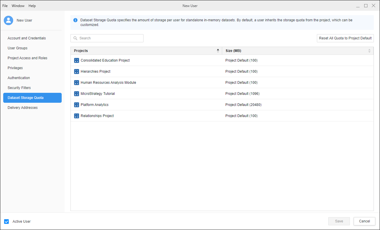 Quota de stockage des jeux de donnéesIndiquez l'espace de stockage maximal dédié à chaque utilisateur dans un projet. Le quota de stockage de l'utilisateur par défaut est la valeur par défaut du projet définie sur la configuration du projet et s'applique à tous les utilisateurs qui ont accès au projet. Pour plus d'informations, reportez-vous à Quota de stockage des jeux de données.