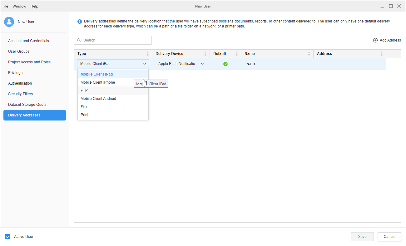 Adresses de livraisonAjoutez des adresses FTP, de fichier, mobile ou d'imprimante pour l'utilisateur si l'utilisateur souscrit à la livraison de rapports et de document, ou si d'autres personnes souscrivent cet utilisateur aux livraisons. L'ajout d'une adresse à l'utilisateur fournit un emplacement pour fournir des rapports et documents à cet utilisateur. Cette section affiche une liste des emplacements de livraison associés à l'utilisateur. Il s'agit des emplacements où cet utilisateur peut recevoir les rapports et documents souscrits. Vous pouvez ajouter de nouveaux emplacements de livraison ou supprimer des emplacements de livraison existants pour l'utilisateur.