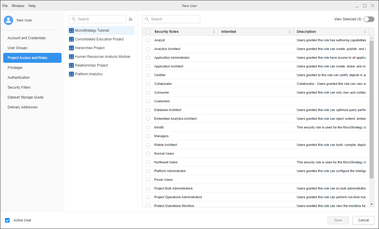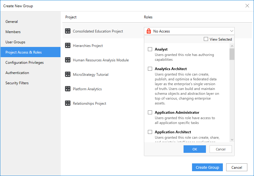 Vous pouvez sélectionner différents rôles de sécurité pour différents projets en fonction du profil utilisateur.