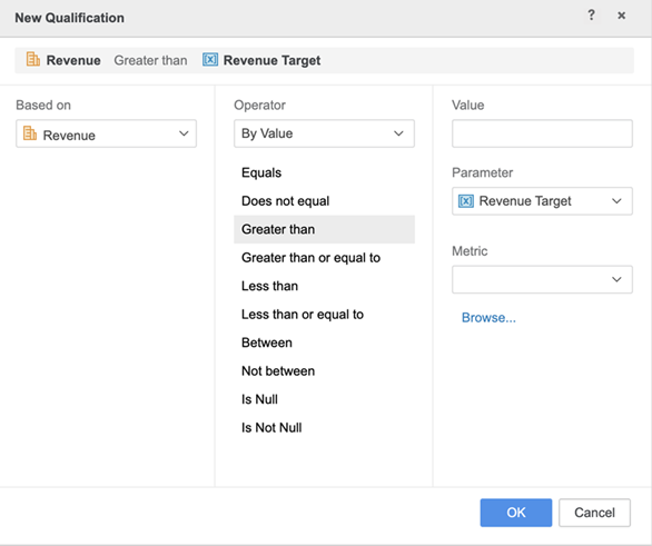 クリック新規条件を追加パラメーターをフィルター条件として追加します表示パラメーターを作成フィルター条件でのパラメーターの使用方法の詳細を表示しています。