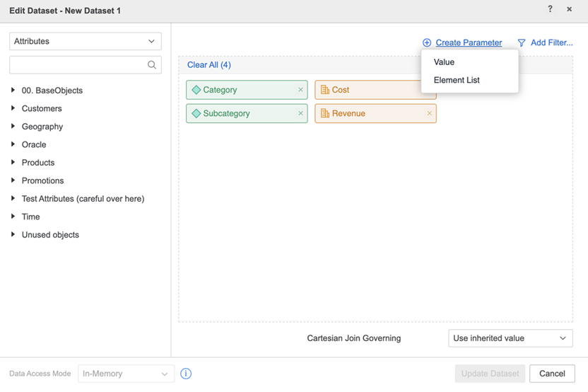 MicroStrategy ONE (2024 年 6 月) 以降、パラメーターをデータセット レベルのフィルター、分析に必要なデータのサブセットのみをクエリユーザーは、これらのパラメーターをフィルター パネルおよび 内キャンバス内セレクター、したがって、クエリがウェアハウスに送信される前に選択が可能です