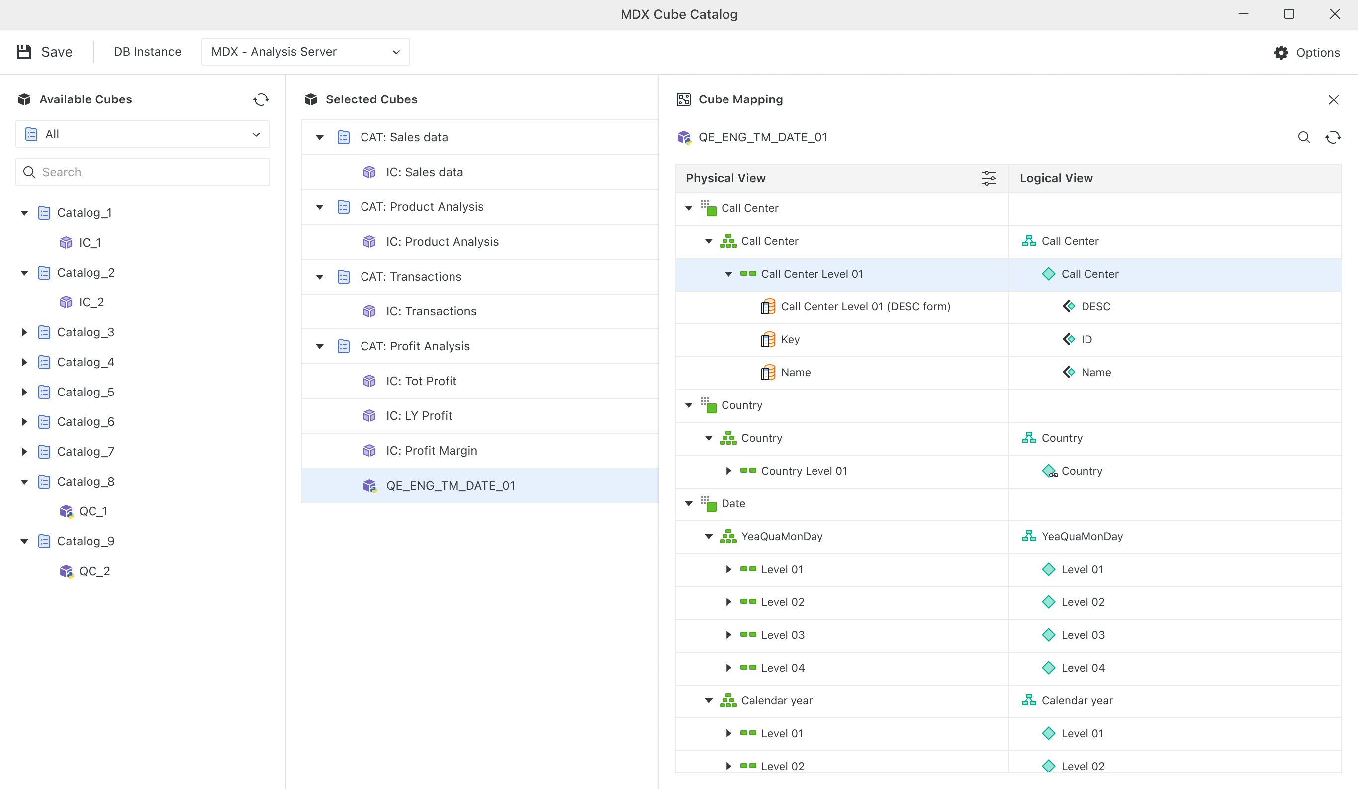 StrategyWorkstation は、MDX cube catalog を管理するための最新で簡素化されたインターフェースを提供します。MDX Cube Catalog Editor を通じて、外部 MDX データ ソースに接続し、利用可能な cube を参照し、プロジェクトに追加できます。