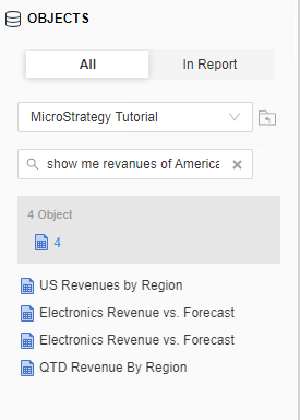 レポート設計モードでオブジェクト検索を使用した次の例を参照してください。「show me revanues of America」と検索すると、タイプミスに関係なく、「US Revenues by Region」や「Electronic Revenue vs. Forecast」などの関連するコンテンツが表示されます。