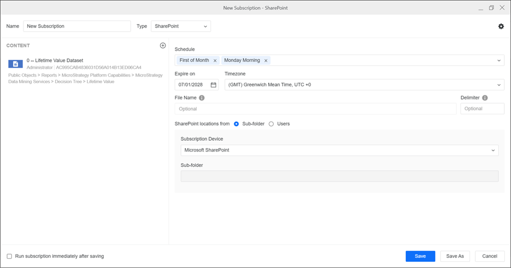 で開始Strategy One (2025 年 3 月) 、ドキュメント、期間またはイベントに基づいて SharePoint 環境にレポートできます1 つ以上のダッシュボードを選択できます、ドキュメント、さまざまな形式のレポートやスケジュールの定義、メッセージの定義、購読オブジェクトの設定を指定できます