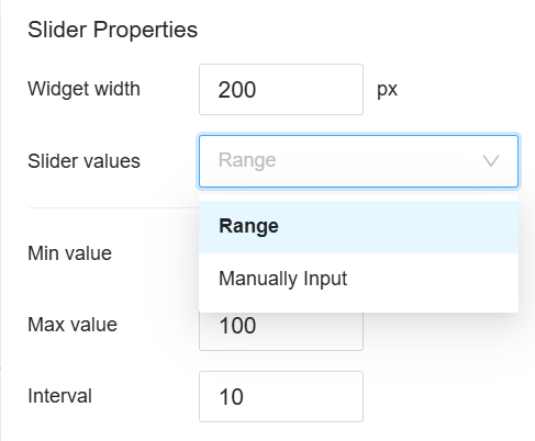 スライダー コントロール タイプの場合、範囲と手動入力の両方がサポートされます。