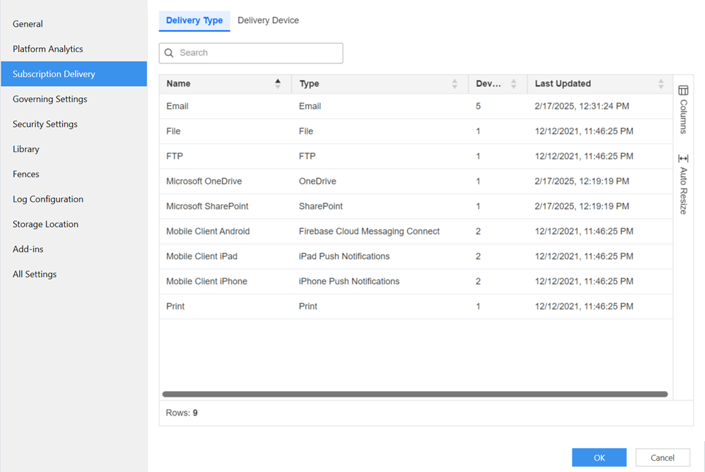 O Distribution Services vem com vários tipos de entrega: e-mails (SMTP), arquivo, impressão e móvel. Por exemplo, uma entrega de arquivo empacota e entrega relatórios na forma de arquivos (PDF, HTML, MS Excel, texto sem formatação e CSV formatos) em locais de armazenamento de arquivos em computadores da rede. Uma entrega de impressão envia relatórios para impressoras da rede para impressão.