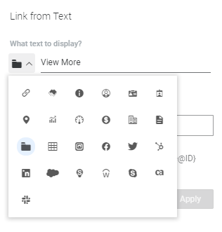 在卡片上,您可以添加静态链接、上下文链接或仪表板链接。无论卡片是什么主题,静态链接都会导航至同一 URL。例如,让每张员工卡上都显示您公司的网站。或者,在卡片中添加上下文链接。您可以通过上下文链接,根据关键字实体形式导航至其他 URL,因此链接会随卡片主题的变化而变化。
