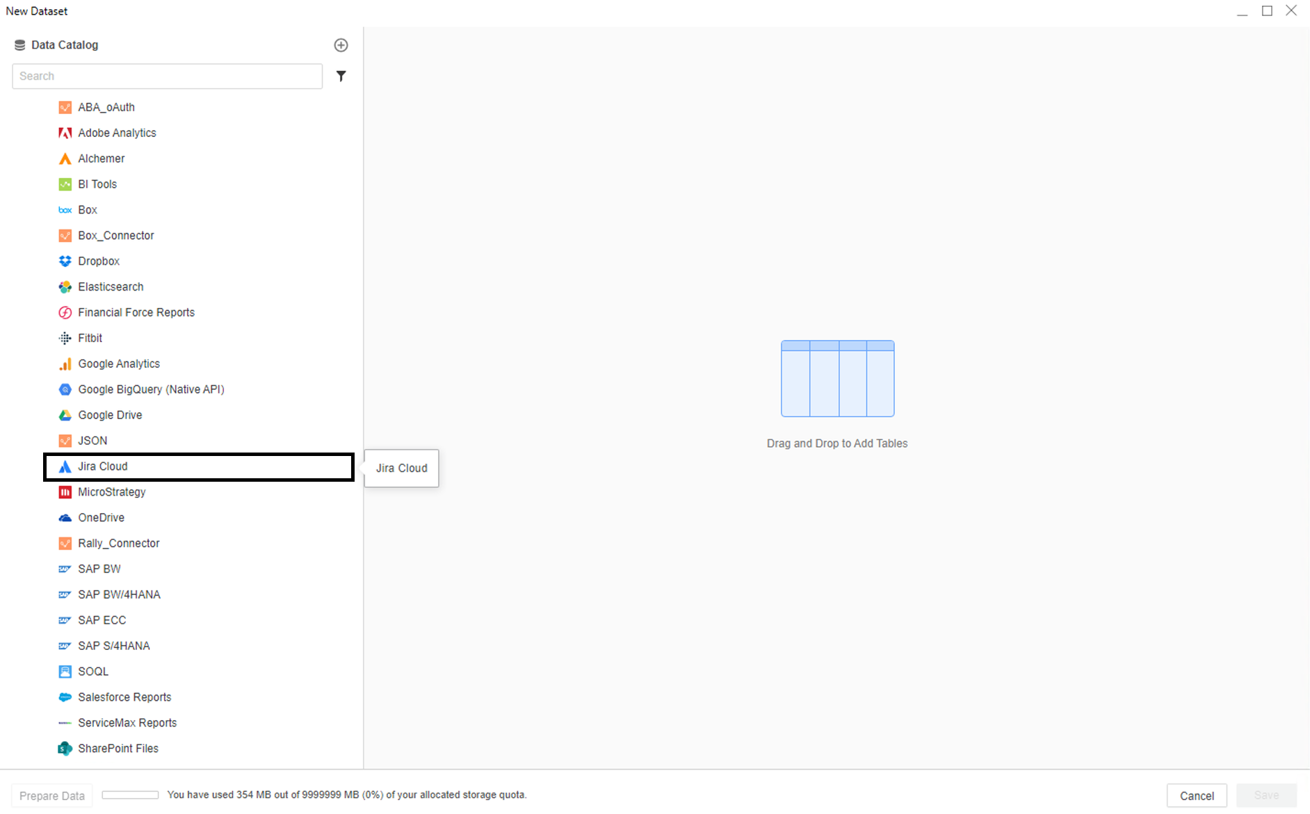 - 从数据源列表单击 Jira Cloud 连接器图标。