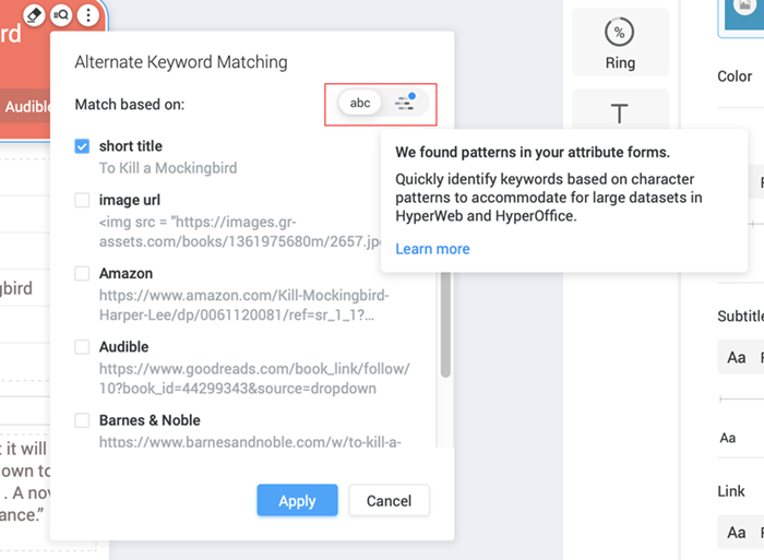 您可以编辑您的属性的自动检测模式。如果您的卡片集中未检测到图案,您可以手动创建和定义它们。对图案定义满意后,单击申请启用模式匹配。