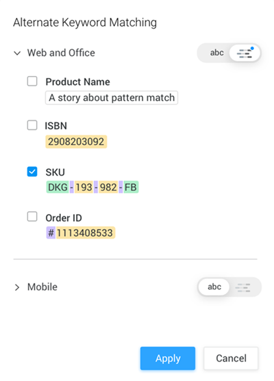 模式匹配使分析师能够通过在关键字上设置字符模式来适应 HyperIntelligence for Web 和 HyperIntelligence for Office 中具有更大数据集或卡片集的用例。模式匹配避免在浏览器存储中下载关键字,从而获得更好、更快的性能。