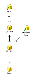 This hierarchical grouping of related business attributes is useful for analyzing data in a reporting project. For example, the sales data is stored in the data source on a daily basis. But what if you want to see a report showing monthly sales data? Because Day and Month are part of the same hierarchy, you can simply drill from the daily sales data displayed on the report, up to monthly sales data. The new report you drill to (which contains monthly sales data) is recalculated automatically based on the drilling path you select. "Drilling up" reflects the direction you are drilling into the data in relation to where the attribute exists within the hierarchy: you drill from Day (shown on the report) up the Time hierarchy to Month (which appears on the new, drilled-to report).