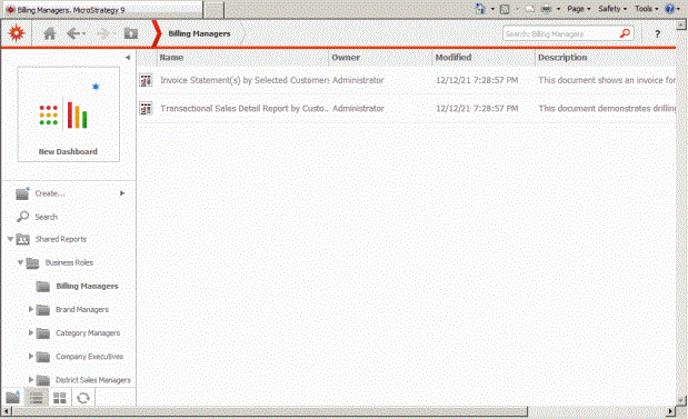 The image below shows some documents in the MicroStrategy Tutorial project, within the Billing Managers folder on the left. Objects within a selected folder on the left (in this case, the folder called Billing Managers) appear on the right side of the screen.