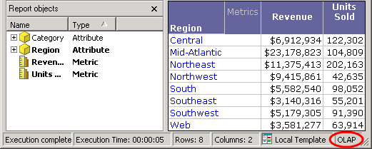 • OLAP report: The report is marked as OLAP (as indicated in the bottom right corner of the Report Editor) because of the dynamic aggregation performed.