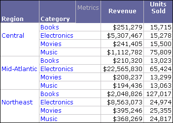 To better understand dynamic aggregation, consider a report that includes two attributes, Region and Category, and two metrics, Revenue and Units Sold. A subset of the report results are shown below.