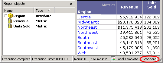 • Attributes remain in Report Objects: Category is now in the Report Objects pane and is no longer displayed with bold formatting. Since Category is part of the report definition, it can be used to define the view of the report. For example, you can build a view filter to return Revenue only for the electronics category. A standard report would have to use the report filter to filter on an attribute not on the report, which would also require re-execution against the data warehouse.