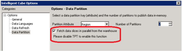 Parallel Data Fetch for OLAP Cubes does not work if any of the options below are chosen for the VLDB setting Data population for Intelligent Cubes: