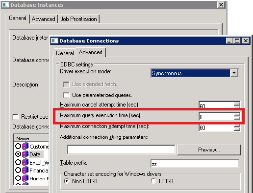 Set the Maximum query execution time (sec) field. This field defines the maximum amount of time a single pass of SQL can execute on the database.