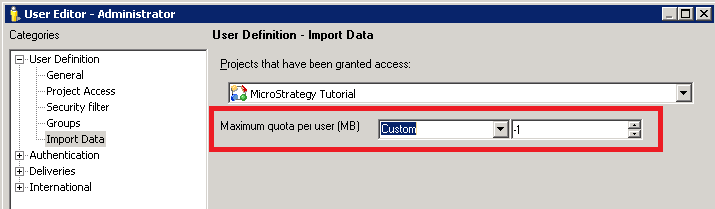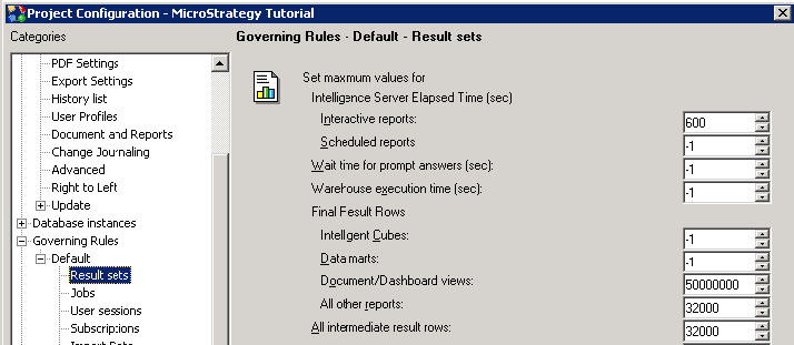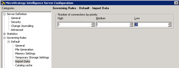 - In the MicroStrategy Intelligence Server Configuration editor, expand Governing Rules, expand Default, and select Import Data.