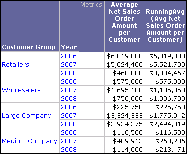 For example, consider a report with Customer Group, Year, Average Net Sales Order Amount per Customer, and RunningAvg (Average Net Sales Order Amount per Customer), as shown below.