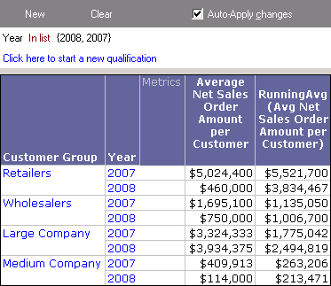 Notice that the values for the RunningAvg (Average Net Sales Order Amount per Customer) metric do not change, only the 2006 values are hidden. The values displayed do not accurately reflect the view of data and instead reflect the data available for the entire report, including the 2006 data hidden from view.