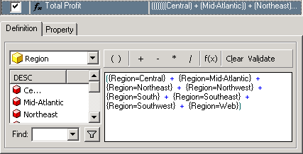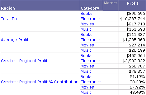 For example, in a report with Region and Category attributes and a Profit metric, you can combine the regions on the report into various groups for profit analysis, as shown below.